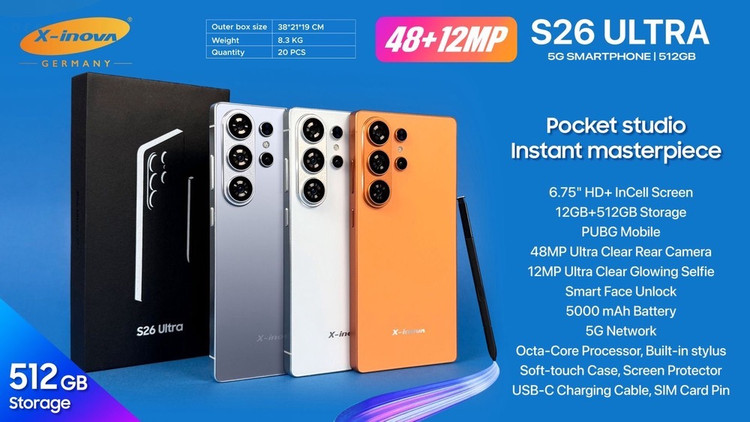گوشی طرح S26 اولترا قلم دار مدل X-inova آلمانی تحت لیسانس با حافظه ۵۱۲ گیگ و رام 12 دو سیمکارت ریجستر شده قانونی