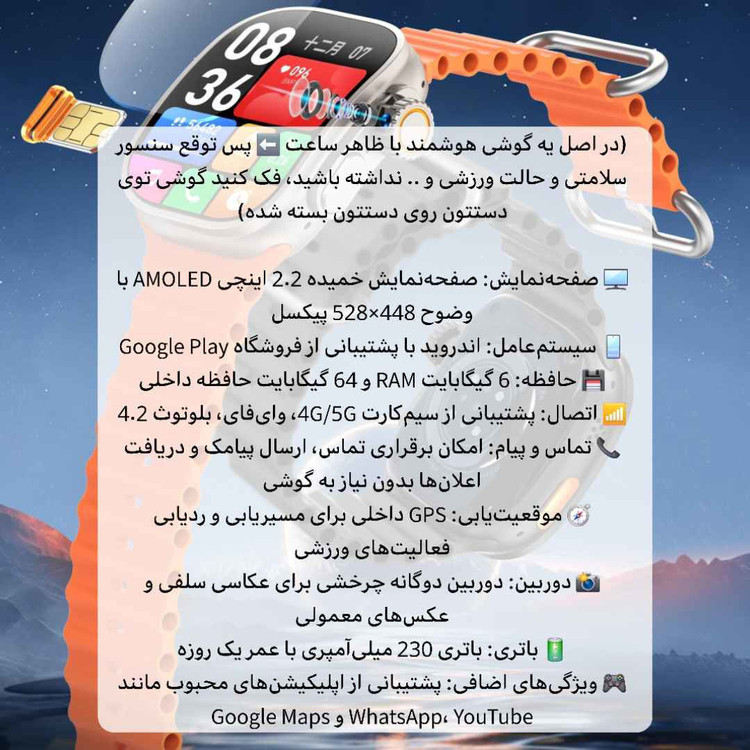 ⌚ «وقتی مچ دستت از گوشی هوشمندتره! با این ساعت دیگه نیاز نیست گوشی رو همهجا با خودت ببری مستقیم از روی مچت تماس بگیر، جواب بده و حتی شمارهگیری کن. پیامک بفرست یا دریافت کن، بدون اینکه گوشی رو لمس کنی. اینترنت و شبکههای اجتماعی همیشه همراهت. آهنگ گوش بده، گامشمار و سنجش ضربان قلب هم داره. طراحی شیک و مدرنش باعث میشه هر جا بری همه نگات کنن، و باتری قویش تا ساعتها همراهته. این فقط یه ساعت نیست، یه گوشی کامل روی مچ دستته! وقتشه سبک زندگیتو ارتقا بدی